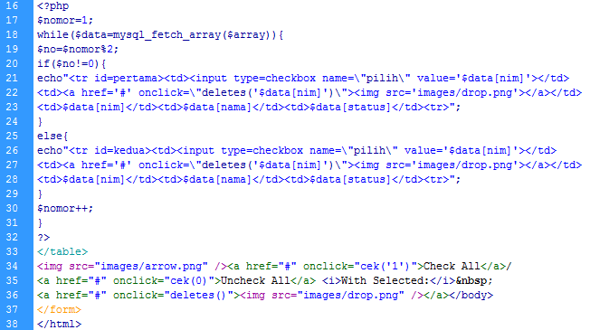untuk script program diatas saya menggunakan bantuan ajax untuk fungsi gabungan antara javascript kemudian melkukan fungsi execution delete menggunakan php. untuk lebih jelasnya dari tiap-tiap tampilan script tersebut silah download disini